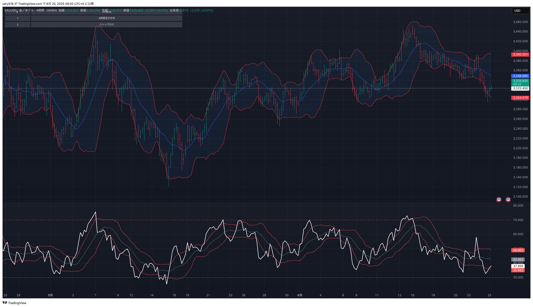 ①ゴールド売り。4時間足のトレンド方向にエントリーも少しタイミングが早くストップに引っかかった。
