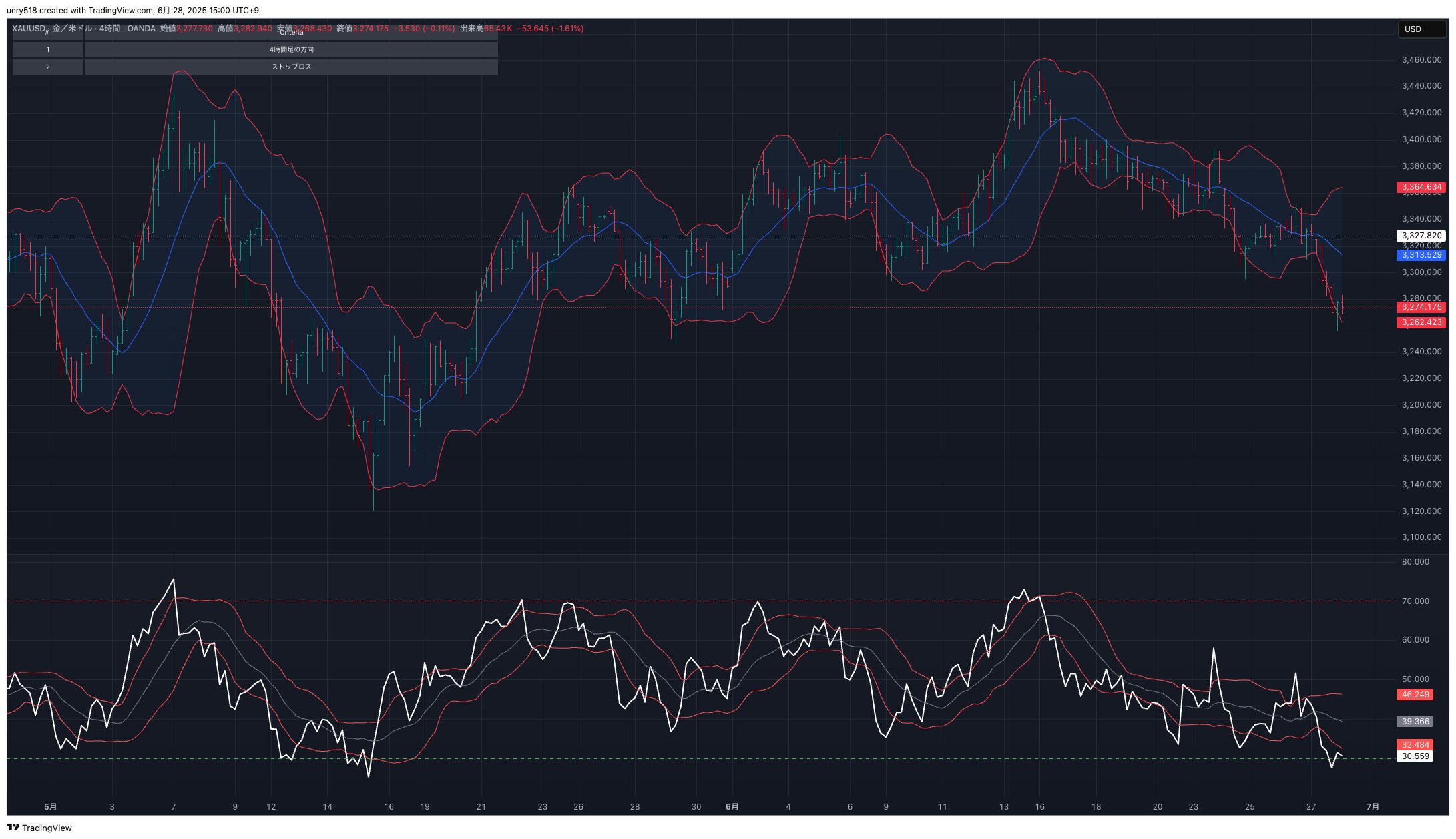 ①昨日から保有中のゴールドの売りポジション。さらに下落したため増し玉を追加。週足・日足でさらに下げる可能性があると判断し、リスクを取って週末持ち越し。