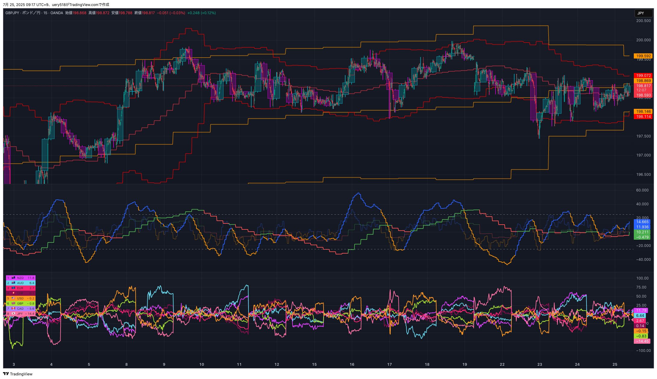 2025年7月24日トレード結果:+1,613円 トレード結果【日次】 X Facebook はてブ Pocket LINE コピー 2025.07.25 15分足の短期トレンドラインの下限付近で買いエントリーし、直近高値付近で手仕舞い。欲を出さずに冷静にトレードできた。まだポジションが小さく金額は少ないが値幅が取れているのでOK。 対象通貨勝敗損益GBPJPY1勝0敗+1,613円